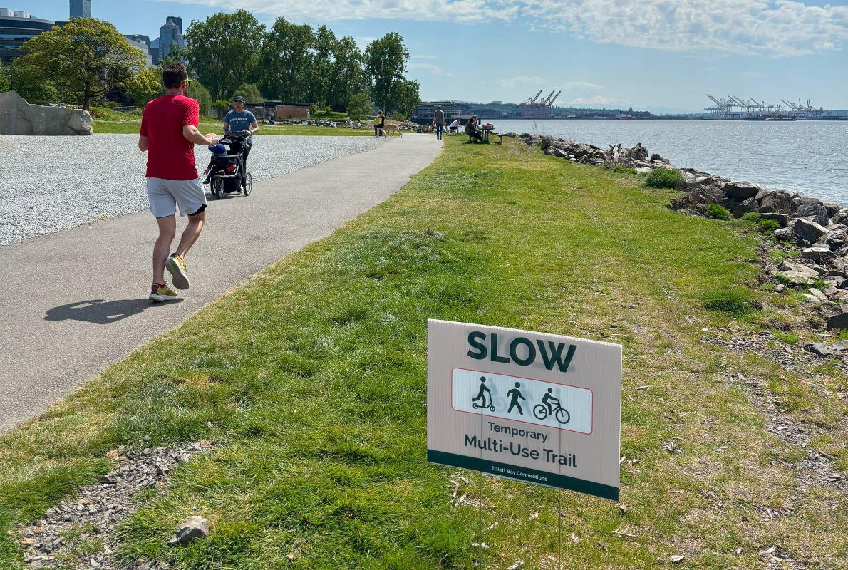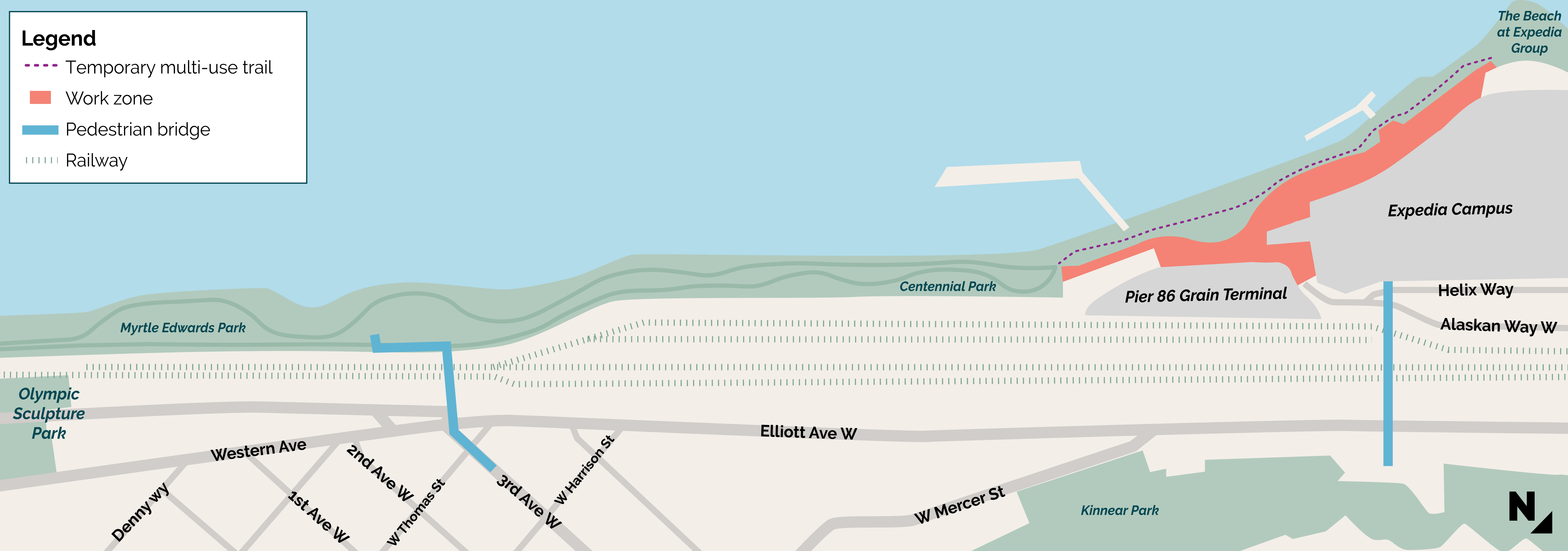 The Elliott Bay Connections (EBC) project is building a new pedestrian and bicycle greenway trail on the east side of Alaskan Way and restoring and revitalizing Myrtle Edwards and Centennial Parks. Construction on the greenway trail began in February 2025, and improvements to Myrtle Edwards and Centennial Park began in March 2025. The project is expected to be complete before Seattle hosts the FIFA World Cup™ in June 2026.