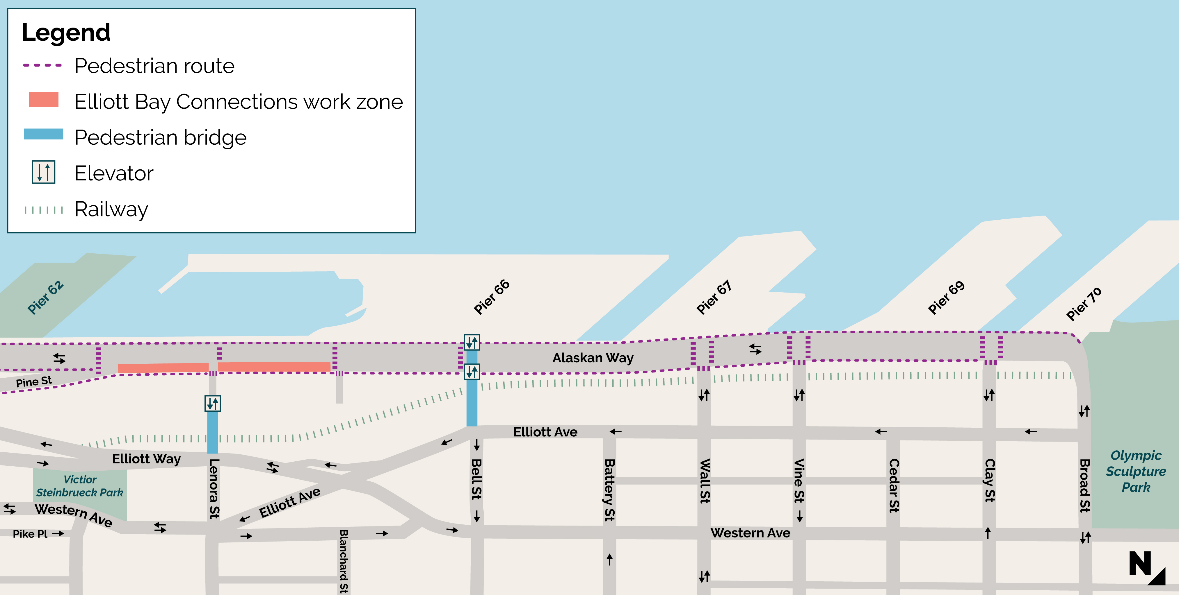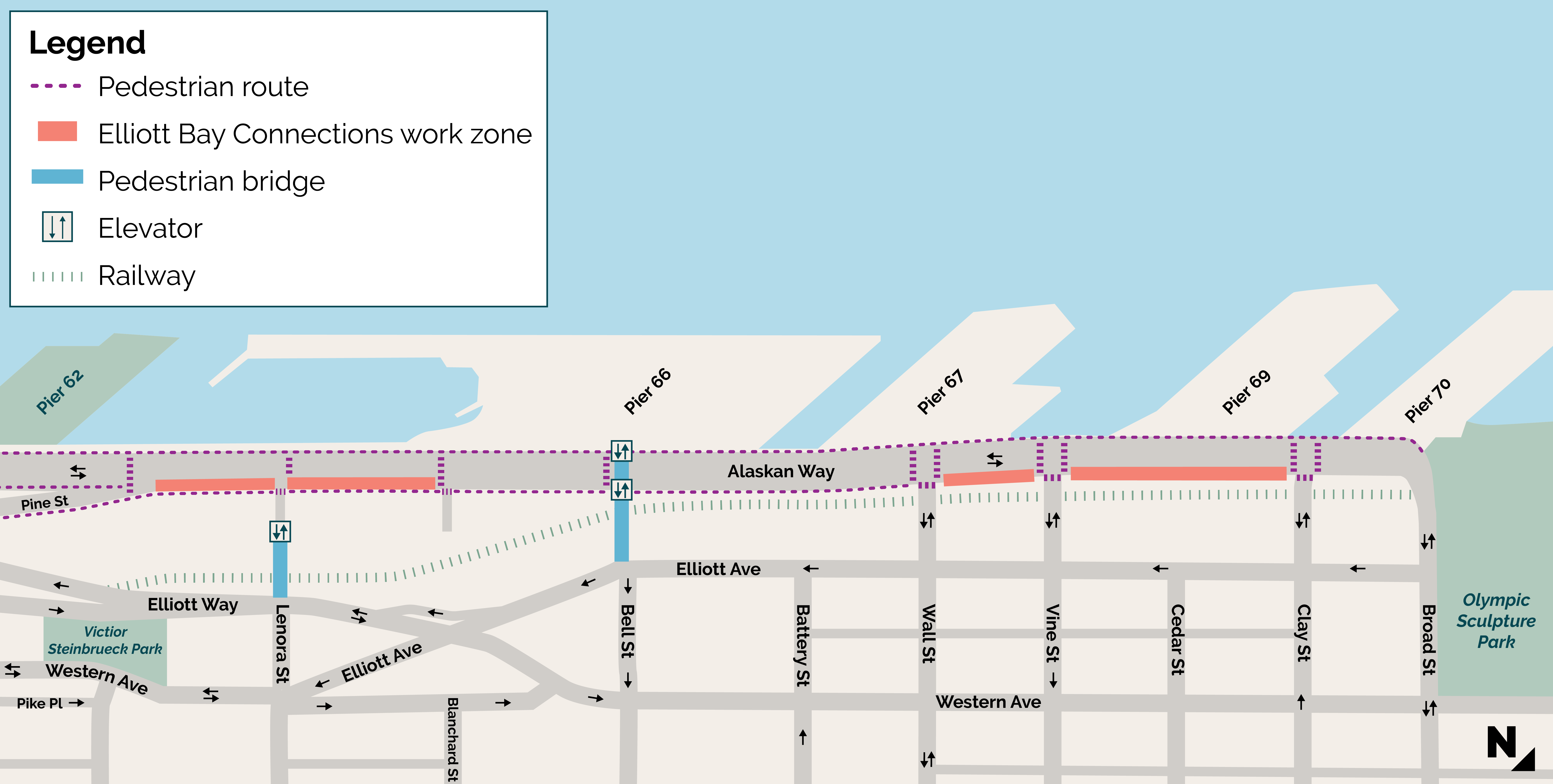 - Sidewalk closed on the east side of Alaskan Way between Wall St and Vine St; pedestrian access maintained at all times on the west side of Alaskan Way
